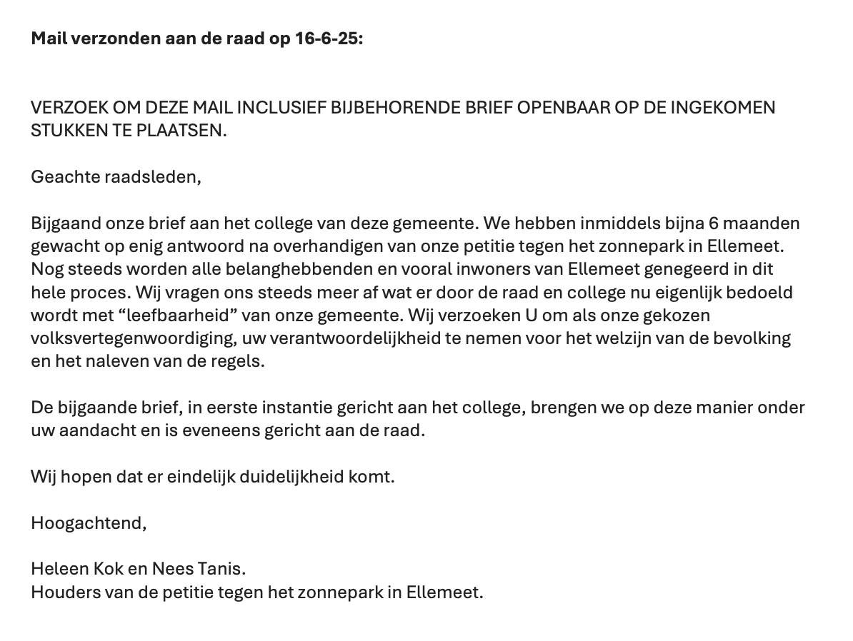 Deze brief is ook d.d. 16-06-2025 naar de raad gemaild met verzoek openbaar te plaatsen.