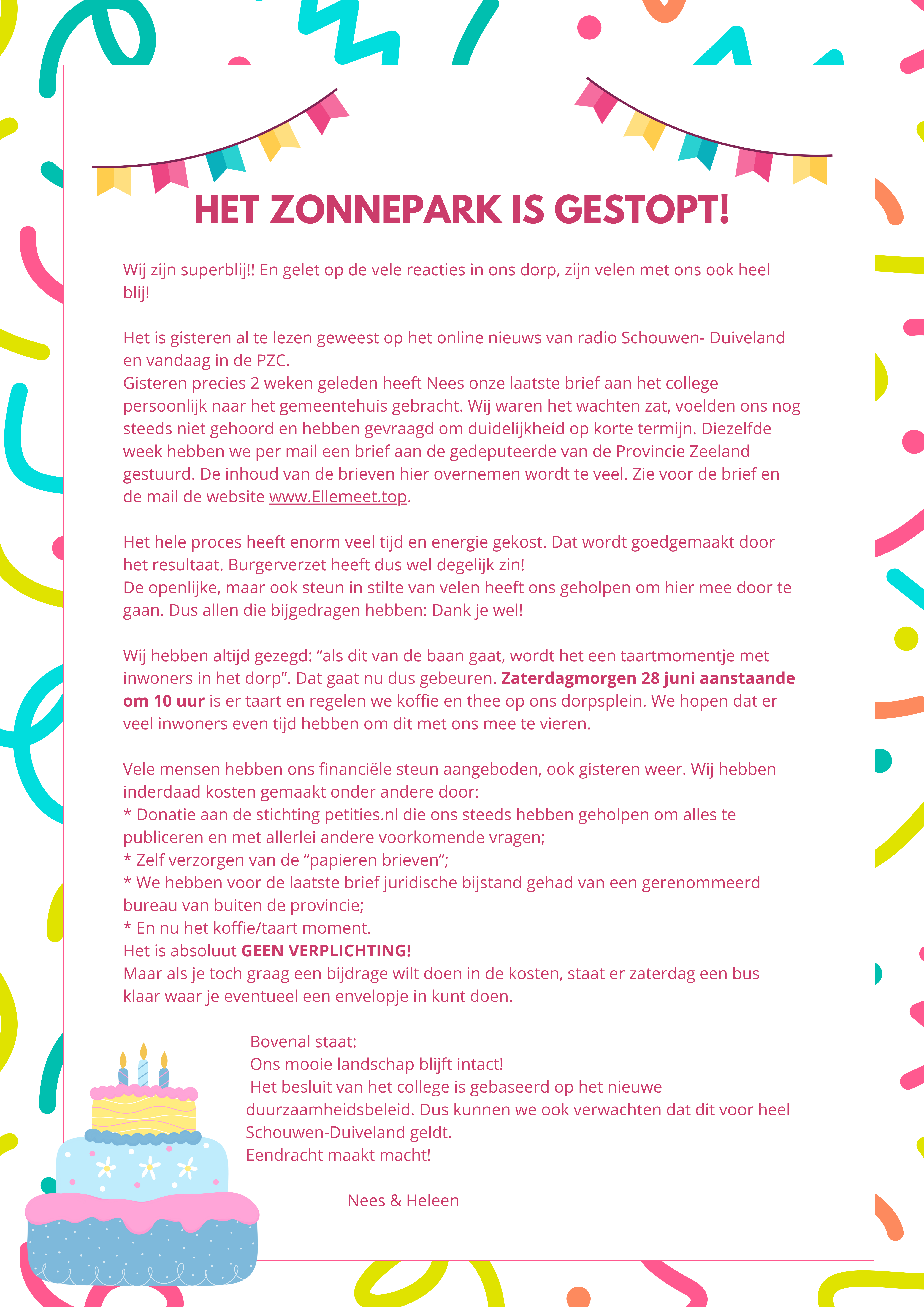Toelichting uitslag enquete: Voor de duidelijkheid, aangezien de enquete enigszins verwarrend was, de genoemde voor-stemmers zijn tegen het zonnepark! En stemden daarom voor een uitgebreide BOPA, waar het indienen van bezwaren en zienswijzen nog mogelijk is.